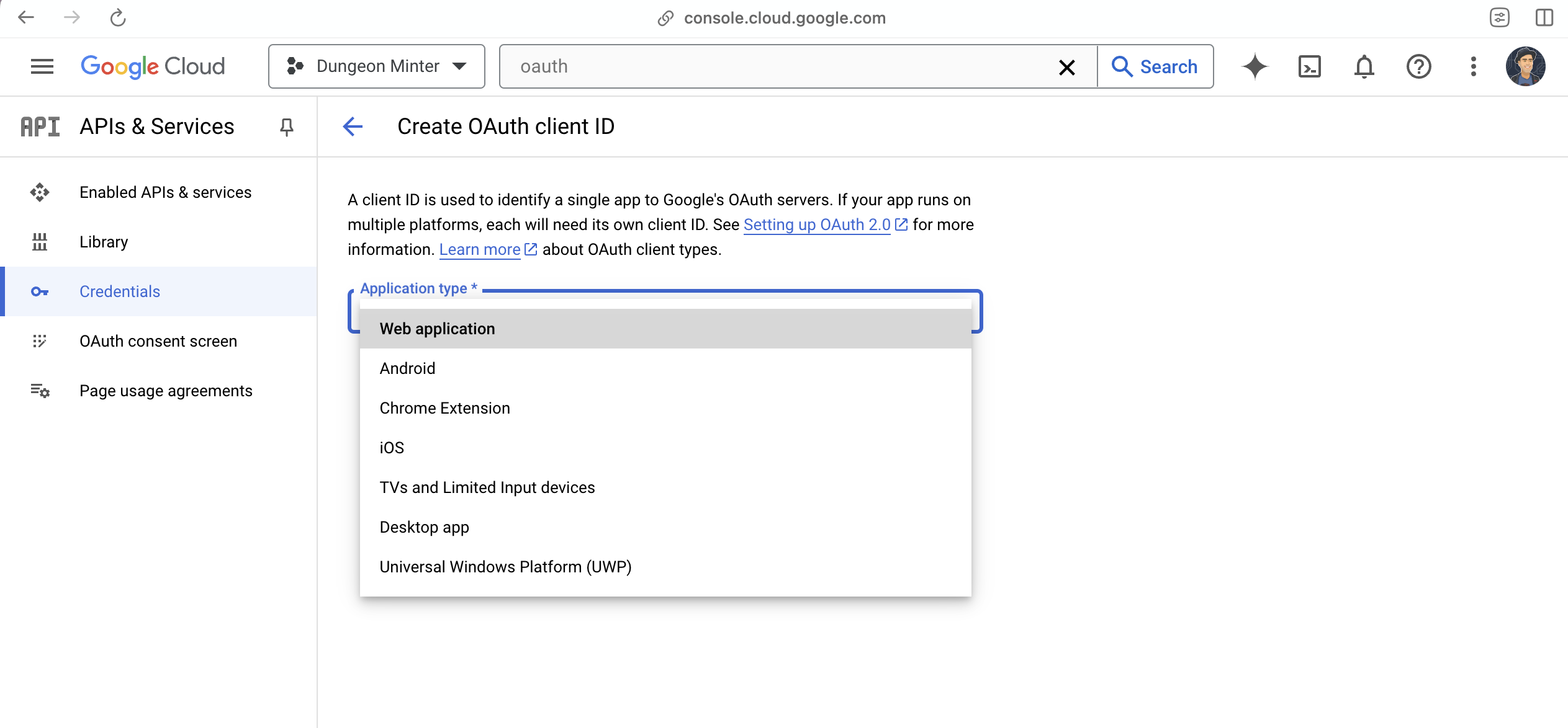 In order to have Google auth integrated into your Embedded Wallet instance, you should configure a Google OAuth client in the Google Developer Console. Depending on whether you are integrating Embedded Wallet into a native mobile, desktop, or web application, you should pick the correct configuration accordingly.