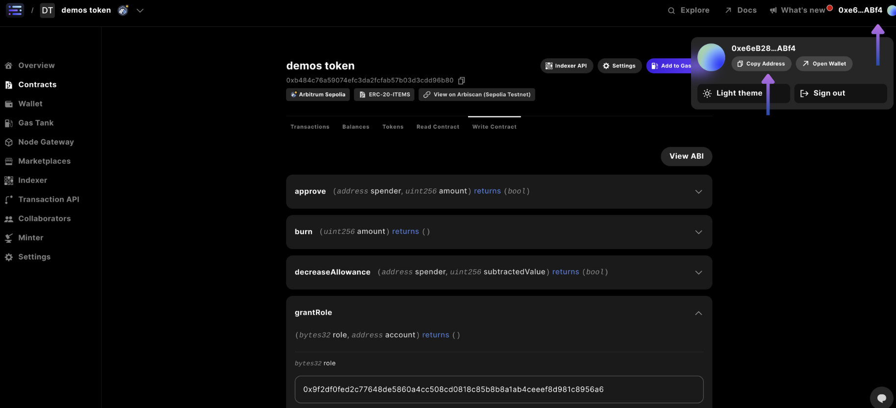 In the grantRole section of the write contract tab navigation