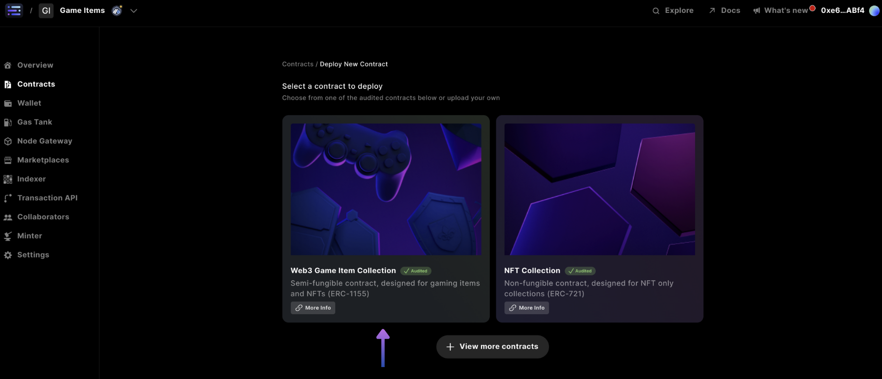 Start by selecting your project in the top left and corner for what you want to create the collectible for, and head to the contracts section and select + Deploy new contract